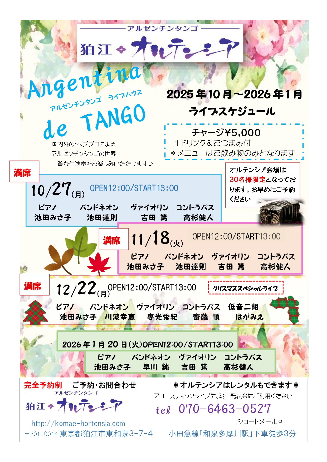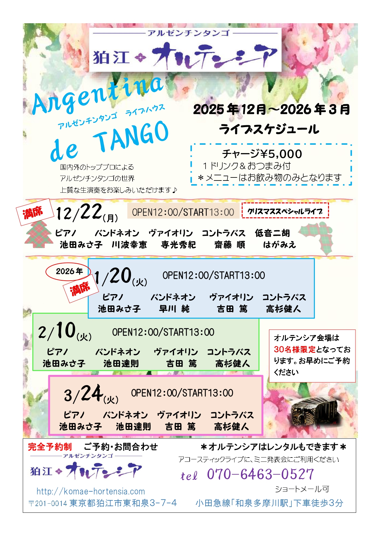 ありがたいことに12/28(火)の狛江オルテンシアライブも完売となりました。