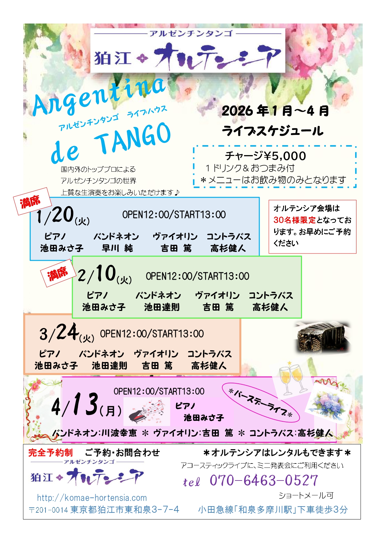 新年早々、1月20日のタンゴライブは緊急事態宣言の為延期となりました。